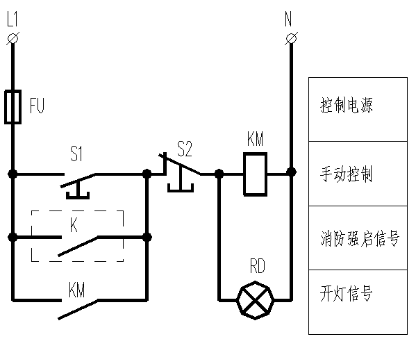尽管应急照明的控制有多种方式,但其原理是相同的,如图1所示,当手动时,按下开灯按钮S1,接触器线圈KM得电,其常开触点闭合,接触器完成自锁,灯具点亮;自动时,火灾自动报警联动触头K接到来自火灾探测器的信号后闭合使得接触器线圈KM得电,其常开触点闭合,接触器完成自锁,灯具点亮。按下关灯按钮S2后,接触器线圈失电,其常开触点复原,受控灯灭。