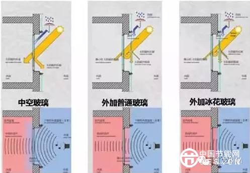 从上面不同玻璃结构遮阳和防噪效果示意图可以看出,冰花玻璃和中空玻璃的配合使用,不仅可以起到很好的遮阳效果,还可以最大限度的减弱室外噪声影响。