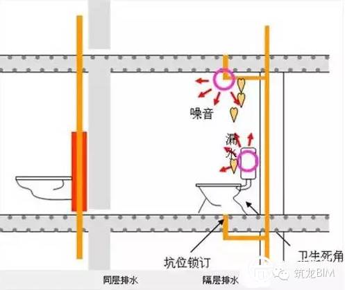 隔层排水:排水支管穿过楼板,在下层住户的天花板上与立管相连。