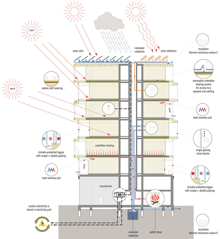 Patch 22 是荷兰最高的木质公寓住宅楼。不仅其外立面完全由木材组成,还有高达30米的木材承重结构,其木材柱,梁和墙都可从室内看到。为了满足防火规范的要求,木材在各个尺度上都有所扩大。当面临火灾时,外层的木头可以持续燃烧120分钟到炭化以保护内部的木结构。这个项目也是荷兰第一栋在高层可以尽享木材空间的建筑。