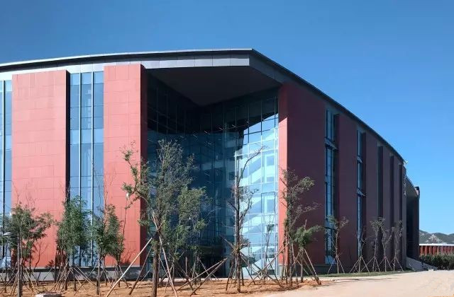 北京化工大学新校区位于北京市昌平区南口镇军都山以南,总建筑规模101万平方米,新校区三面环山,环境优美。体育馆位于校园南侧主入口轴线以西,建筑呈西南-东北走向,主体量由四条弧线定义而成,与校园内道路及空间走势相协调,由训练馆、可容纳4000人的球类比赛馆和游泳馆三部分组成。