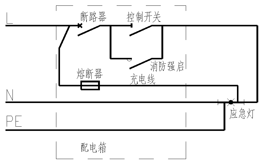 图4中应急灯采用节能自熄式开关(电子触摸式定时开关、振动式定时开关、声控定时开关),平时由节能开关控制,火灾应急时,工作人员可以通过设在配电箱内的强启按钮S1使应急照明灯具强制点亮,同时在本楼的普通人员也可以通过按动设在本楼各处显眼位置的应急强启按钮S3强启应急照明灯具,而当应急情况需要解除时,工作人员按下设在配电箱内的解除应急强启按钮S2既可。
