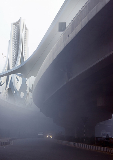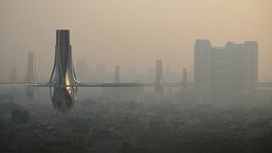 总部位于迪拜的“兹尼拉建筑工作室”(Znera)提出了一个设想,建造一个100米高的塔楼网,吸收烟雾并净化德里令人窒息的空气。