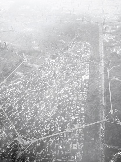 桥梁将连接垂直的空气净化器,它将安排成六角形的形状,并放置在城市的关键点。
