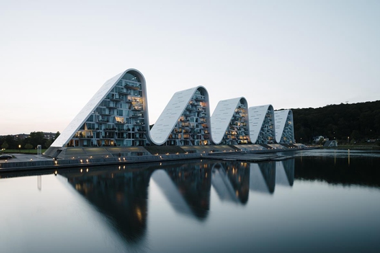 这个名叫“波浪”(Wave)的项目在丹麦瓦埃勒(Vejle)的峡湾边,是由5个有100套公寓的大楼组成,形状像一系列波浪。该项目还包括一个公共码头。