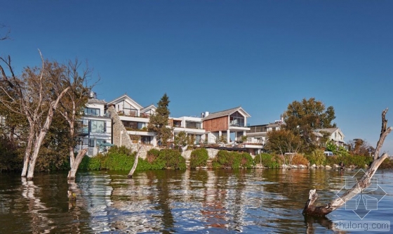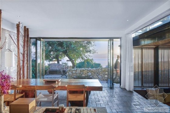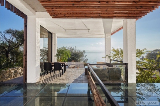 当然,守着洱海这片天然美景,设计团队自然不会放过这个借景的好机会。怎么才能跨过酒店前的马路一览洱海美景呢?他们采用了一个半下沉的公共空间,空间下面通过隔墙低下来的地方,可以建立与水景的心理联系,空间上面设计了一个平台,建立起与洱海水景更为直接的关系。这个平台用了钢结构,右边所接的建筑是开敞的,让二楼更有一种地景感而不是建筑感,而从马路上回看酒店,建筑也显得更加空灵、轻巧,不像周边房子那样很实。