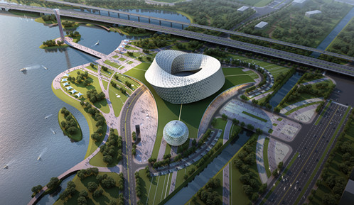 创意来自太极图,象湖内设立“玲珑塔”中标候选方案“云极天下—科技云·太极魂”的设计立意,来源于道家图腾——太极图,设计创意由太极旋转的曲线融入圆环中,形成莫比乌斯环。太极图的无穷奥秘象征中原大地厚重文化源远流长、博大精深,莫比乌斯环的神奇美妙象征中原大地科技创新永无止境、越来越好。据悉,河南省科技馆新馆建筑工程高度约60米,地下一层、地上五层。设计方案采用“三点一线”的空间结构。首先,在象湖设置一个80米高的玲珑塔;其次,设置一个圆形主题建筑,让观众在不同的角度都能看到一个完整的、唯美的建筑形象;再次,把这个圆形建筑升高,置于附属用房之上,用高度进一步提升其标志性;最后,用美丽的绿植覆盖在附属用房的屋顶上,远远看去,仿佛一朵白云飘在生机盎然的绿坡之上,将建筑和环境有机融合在一起。