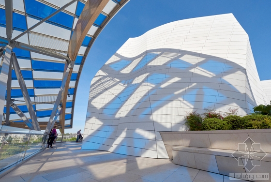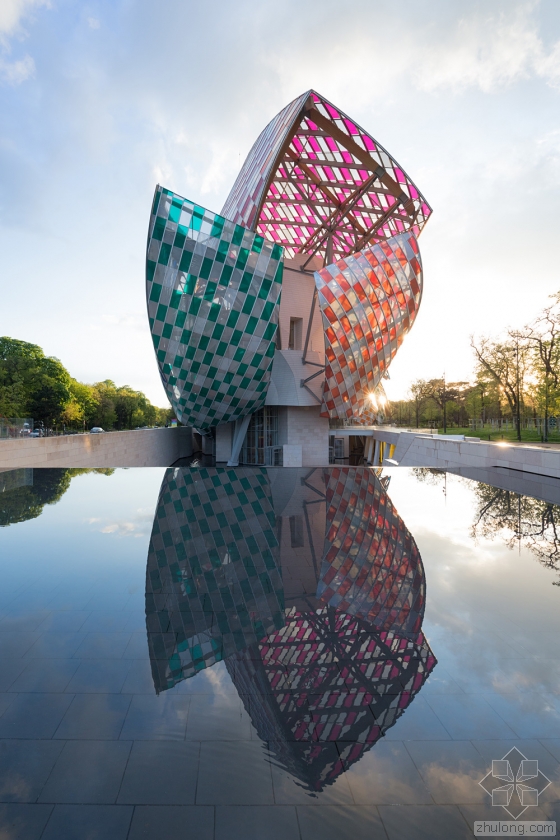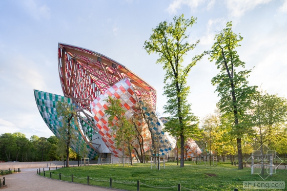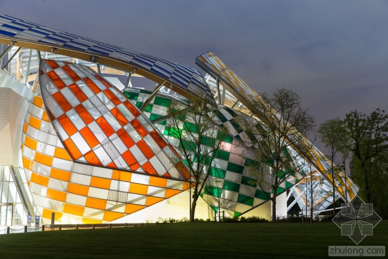 在艺术家Daniel Buren的设计下,由弗兰克·盖里设计的巴黎路易威登基金会的白色玻璃弧形船帆有了丰富多彩的色彩,更确切地说是13种颜色。与夏季十分搭配。Buren设计的临时格子,是与弗兰克·盖里联合开发的,名为“光之瞭望台(The Observatory of Light)”。该建筑的3528块玻璃板均使用了染色过滤器以及8.7厘米宽的白条,历时29个晚上,超过5个星期。