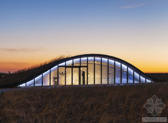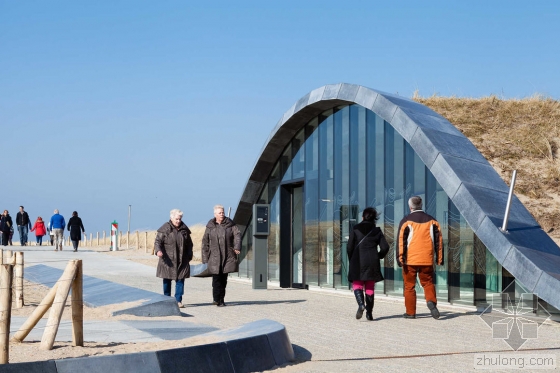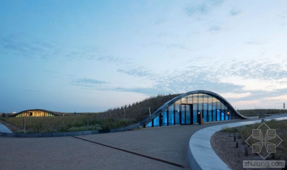 那如何让这个停车场出入方便呢?负责景观设计的 OKRA 在面向沿海公路的一侧设置了 2 个车辆出入口,它的外形类似穿山隧道的入口,各有三个车道。面向海滩、紧靠人行道的一侧,则开设了 5 个行人出入口,装有全玻璃门。这个设计相当于将公路和海滩从地下打通,来玩的人停完车直接就可以到达海边,无需像原来那样走一大段路。为了保证美观,行人出入口均顺着山丘走势被设计成弧形,略微高出路面,完全融入到沿海景观中。白天,玻璃门辅助增强出入口照明;夜晚,内部照明则同时扮演了路灯的角色。
