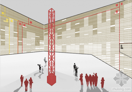 整体盒型的运动馆由“雨幕”外墙包裹,“雨幕”由水平窄木条构成,并且有若干类似邮箱投递口状的立面开口。此外,外立面并没有直达地面,而是设置了若干混凝土坡道和楼梯提供进入场馆中心的入口。
