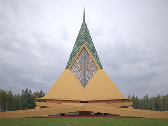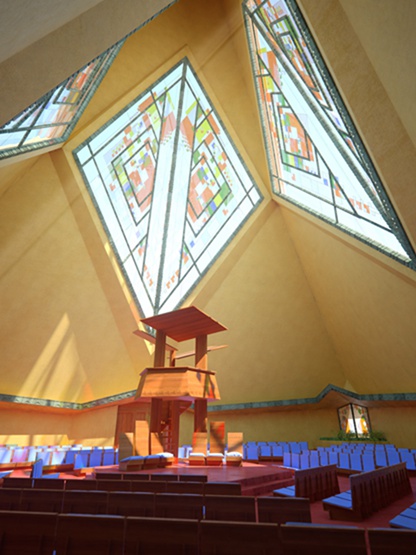 据报道,西班牙建筑师大卫-罗梅罗(David Romero)将弗兰克-劳埃德-赖特(Frank Lloyd Wright)设计的一个未建教堂的设计还原为现实形象。其特点是有红色通道、绿色瓦尖顶和彩色玻璃窗。
