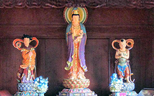 这是因为甘露寺最早是一个供奉送子观音的茅庵,当年叶祖洽为还母愿修建甘露寺时,在主阁楼安排不下观音殿,只好在大雄宝殿的如来佛祖前面供奉了一尊观音菩萨,这也是甘露寺香火特别旺盛的根本原因。