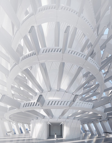 在基座上,一个凸出的镀铬的“光环”围绕着大厦的玻璃入口上方。在多层大厅内,参观者会被人工照明的明亮的白色空间所吸引。