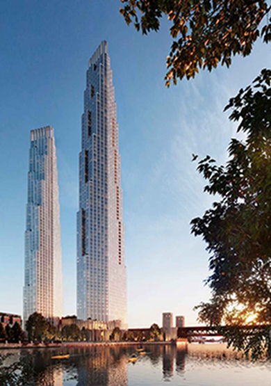 由建筑师大卫-蔡尔兹(David Childs)设计的两幢“姐妹摩天楼”,将建设在芝加哥的湖边的一个场地上。同一个地块上的圣地亚哥-卡拉特拉瓦(Santiago Calatrava)设计的“芝加哥螺旋塔”(Chicago Spire)项目,不幸已停工10年。