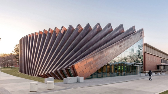 据报道,比贾克-英格尔斯集团(BIG)完成了马萨诸塞大学(University of Massachusetts)阿默斯特商学院的扩建,新建筑的墙壁逐渐倾斜,类似于倒塌的多米诺骨牌。
