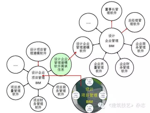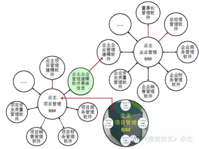 从项目设计到竣工的全过程,运维、业主、施工、设计、监理、质监站、安监站、住建局都会根据各自需要从各分BIM模型中逐步收集信息(图29),分项工程数据被聚合到各方项目管理BIM(图30)。由此,运营维护管理软件所需信息可从中获得,再通过运维管理软件实现各种管理(图31),通过图27获得的实时信息,业主项目和企业能够进行实时管理。这就能够清晰地反映出施工项目和企业实时管理的关系(图32),以及设计项目和企业实时管理(图33)的关系。