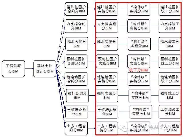 (2)研究分BIM数量划分及总、子、分BIM数据应包含的内容。“设计分BIM”之后都有如“暖通和空调设计分BIM”的合约分BIM及竣工分BIM(图7),如“基坑支护设计分BIM”之后的合约分BIM及竣工分BIM数量(图8)。