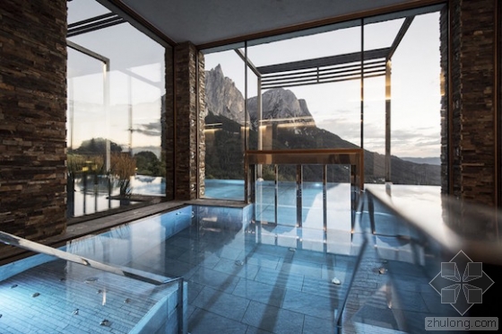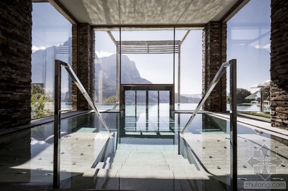 整个设计在整体氛围的营造上也颇花心思。比如,设计师做了一个室内外无缝衔接的无边泳池,以一道透明玻璃门隔断,而对应地,在酒店另一面的桑拿区,自然湖水也以类似的方式穿梭在酒店内外。