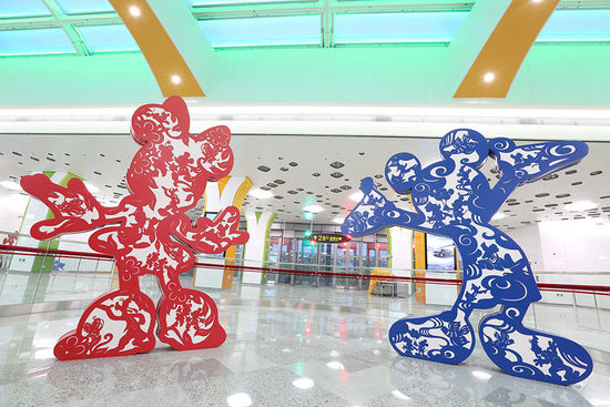 今日开门迎客的迪士尼站不仅有诸多具有梦幻色彩的室内装饰:米奇头像主题墙,融合了中国剪纸的米奇和米妮两个雕塑,站台上迪士尼五个经典动画人物和上海天际线的贴纸……此外,站厅内还有诸多人性化设施,如无障碍电梯、坡道和无障碍厕所,为方便家长为婴幼儿哺乳及更换尿裤而设置的母婴室等。