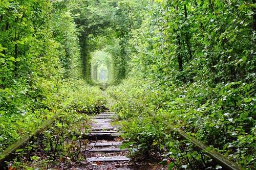 在乌克兰有这样的一条电车轨道,年复一年运行的轨道车在高大的乔木中开辟出了一条绿色长廊。每当夏日来临,枝繁叶茂的植物撑起了一片碧绿天空。鲜嫩的颜色绿得醉人,吸引了众多游客游览这一景观,特别是情侣们。传说相爱的情侣在这里许愿都会梦想成真。