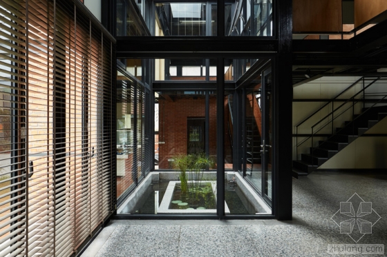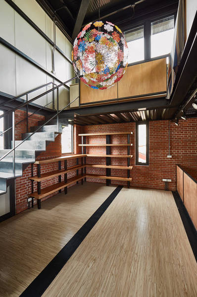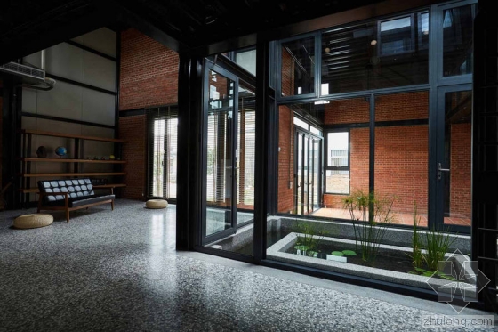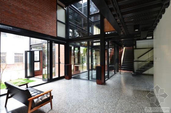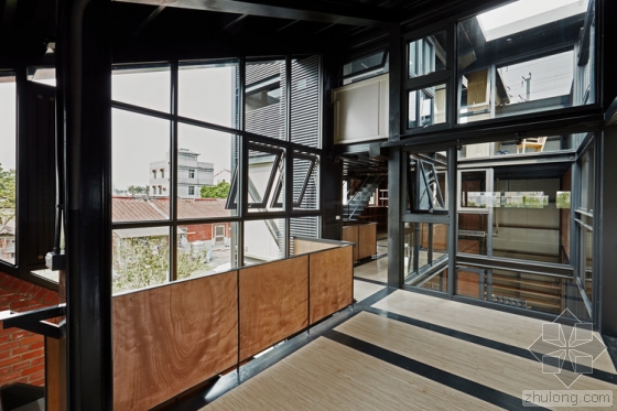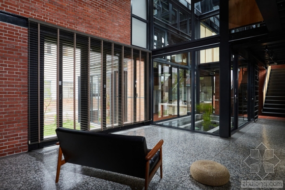 c.金属板外墙与结构间也刻意镶嵌,使主体钢构造完整外露,光滑的质感与朴实粗旷的砖墙在室内及室外都形成有趣的对话效果。
