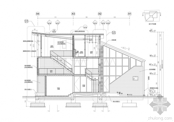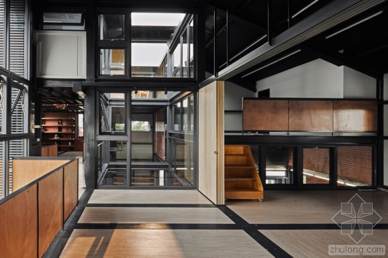 构造有以下特点:a. 2楼以上全部结构楼地板采用降板方式镶嵌在梁结构的框架单元中,此作法产生的效果是全部外墙可在不经刻意修饰的情况下完整呈现纯粹的梁柱构成样貌,室内地板也刻意呈现了钢梁的存在,与木质地板形成几何图案,成为2楼及3楼地板的特色。