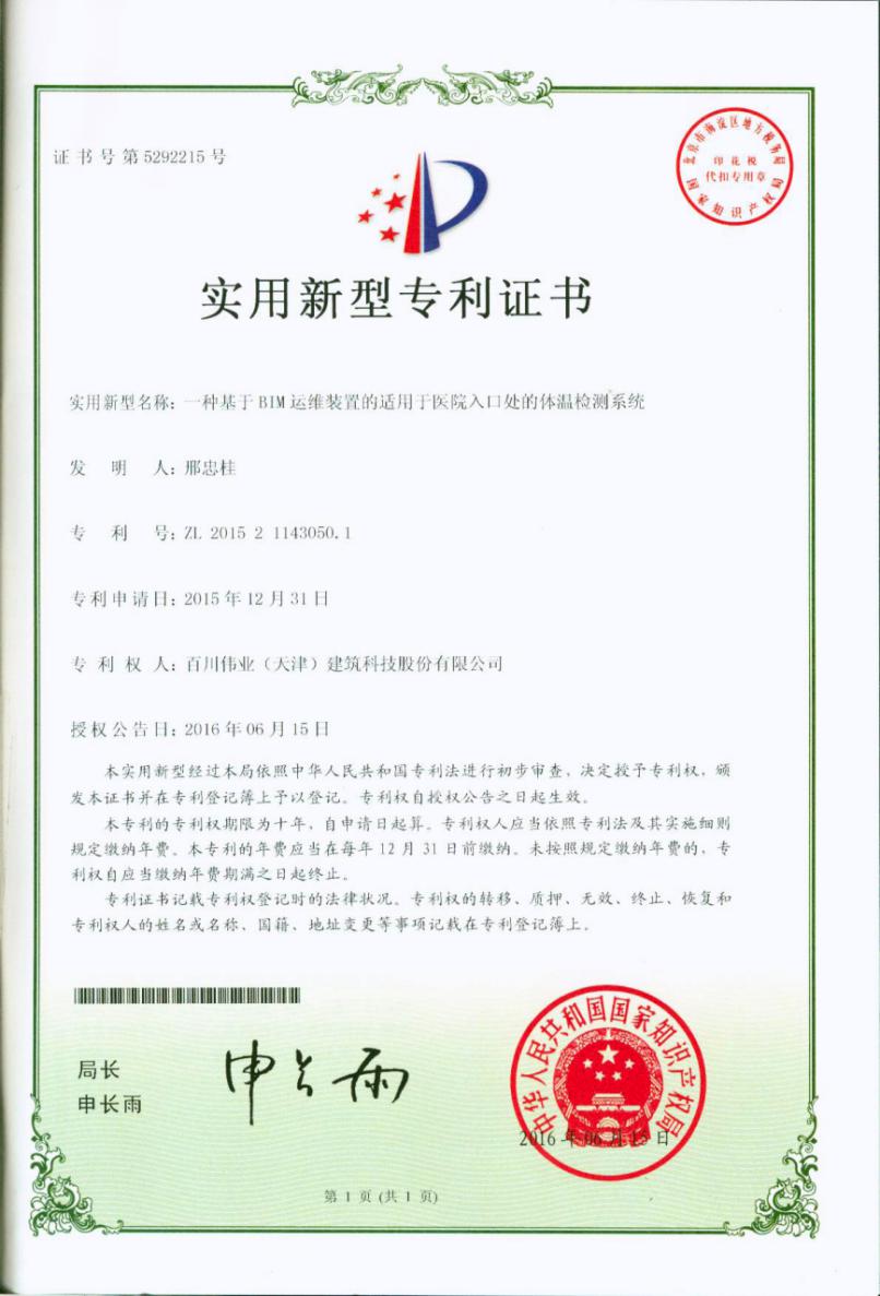 2016年6月15日,百川伟业(天津)建筑科技股份有限公司(以下简称百川建科)与某医院合作的BIM运维中研发的“一种基于BIM运维装置的适用于医院的室内定位系统”和“一种基于BIM运维装置的适用于医院入口处的体温检测系统”两项专利获得了中华人民共和国国家知识产权局颁发的实用新型专利证书。
