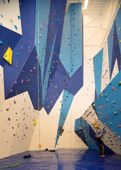 该建筑包括一个高大的,有角度的登山主体设施,包括室内攀岩墙和有卵石铺设的房间,以及更低的单坡形房子,有更衣室、咖啡厅、图书馆和办公室。