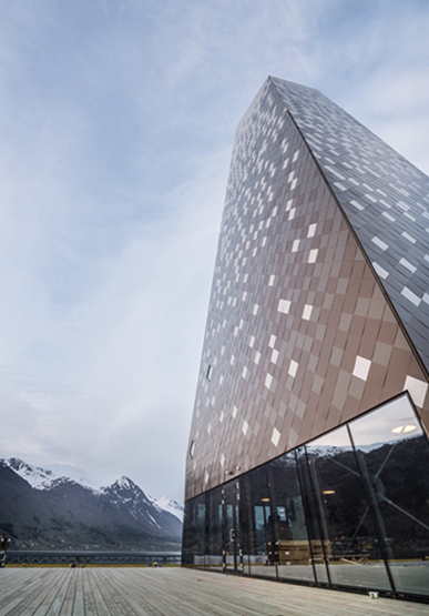 据报道,挪威的雷尔夫-拉姆斯特德建筑事务所(Reiulf Ramstad Arkitekter)设计了一个造形新颖的登山中心。这个锯齿形的建筑由灰色的、棕色的和白色的小圆石覆盖。这个设计方案,参照了建筑后面的积雪覆盖的山峰。