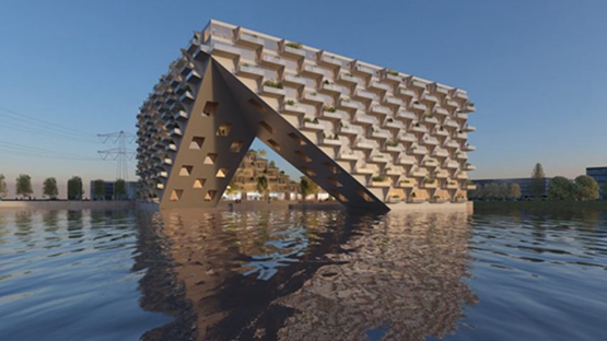 这个设计方案由比贾克-英格尔斯集团和总部设在鹿特丹的条码建筑事务所创造。它的特点是两个巨大的斜面角,向下延伸到防波堤或水面,在中央形成一个庭院。