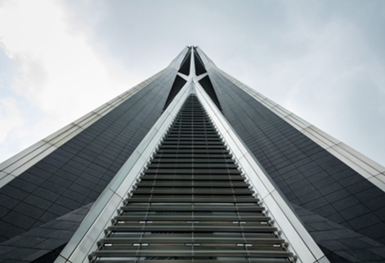 山形柱定义了这幢摩天大厦的四个角,建筑朝着顶部观景台变窄,然后拓宽,可以看见下面的街道。