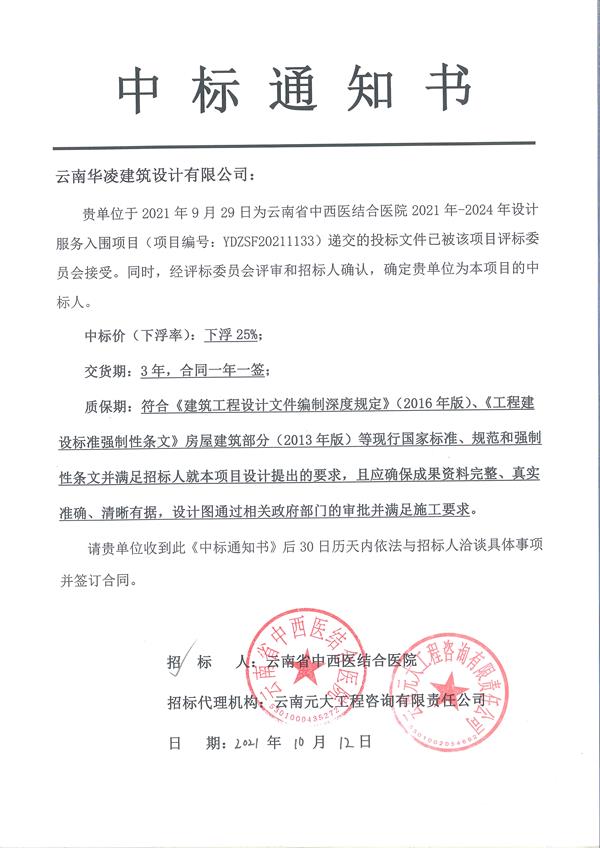 我公司于2021.9.29日参与云南省中西医结合医院的云南省管中西医结合医院2021-2024年设计服务项目的投标工作。并于2021年10月12日取得中标通知书。