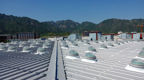 主赛场上空的通风管道和喷淋管道密布,通过屋面定位、地面定位及配合使用角度适配器,从而达到索乐图导光管采光系统整体排布均匀的效果。